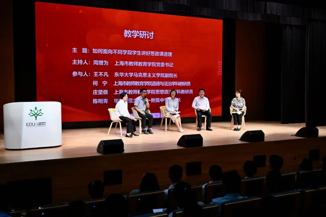 上午的观摩环节在于漪教育教学思想研究中心举行。与会代表观摩了上海小学、初中、高中和大学等学段的思政课教学实践,参观了上海思政课课程体系构建、课程资源供给、教师队伍建设、数智化教学应用方面的规划、机制和实践成果。在跨学段说课与研讨环节,来自上海小学、中学和高校的教师以“中国人民抗日战争暨世界反法西斯战争胜利80周年”为切入点,生动展示课堂设计与教学理念,专家学者围绕“如何面向不同学段学生讲好思政课道理”展开深入交流研讨。